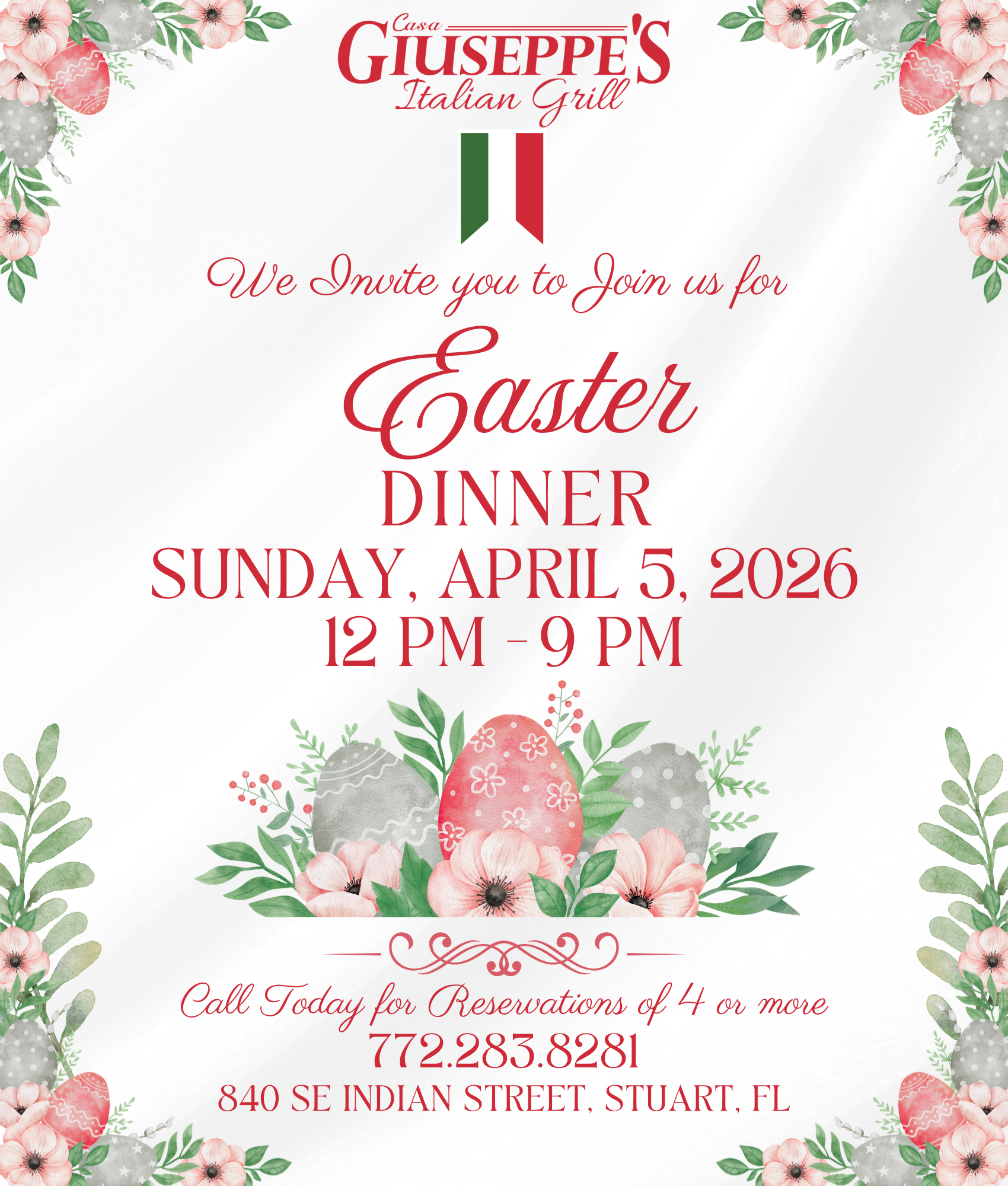 JOIN US FOREASTER SUNDAY DINNER 2026OPEN 12PM-9PM Gather with family and friends for a beautifulEaster Dinner filled with classic Italian flavors! Click to Call! 772-283-8281